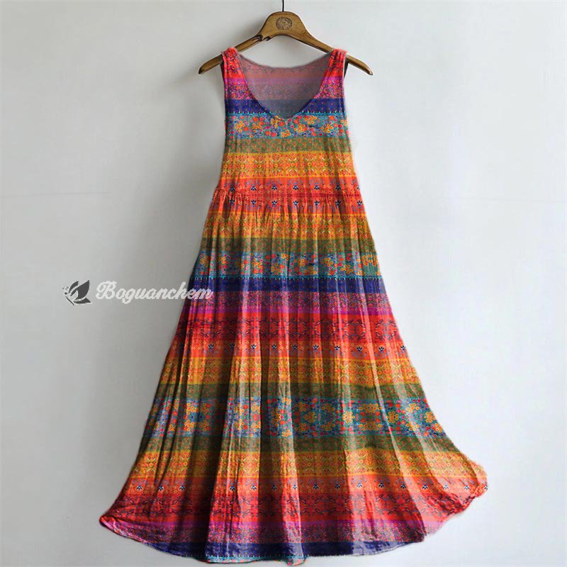 Women's Vintage Art Print Sleeveless Cotton Pocket Dress