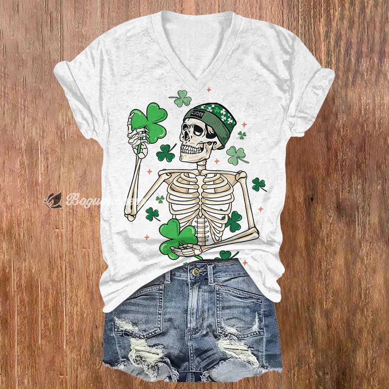 St. Patrick's Day Lucky Skeleton Pattern Short Sleeved V-Neck T-Shirt