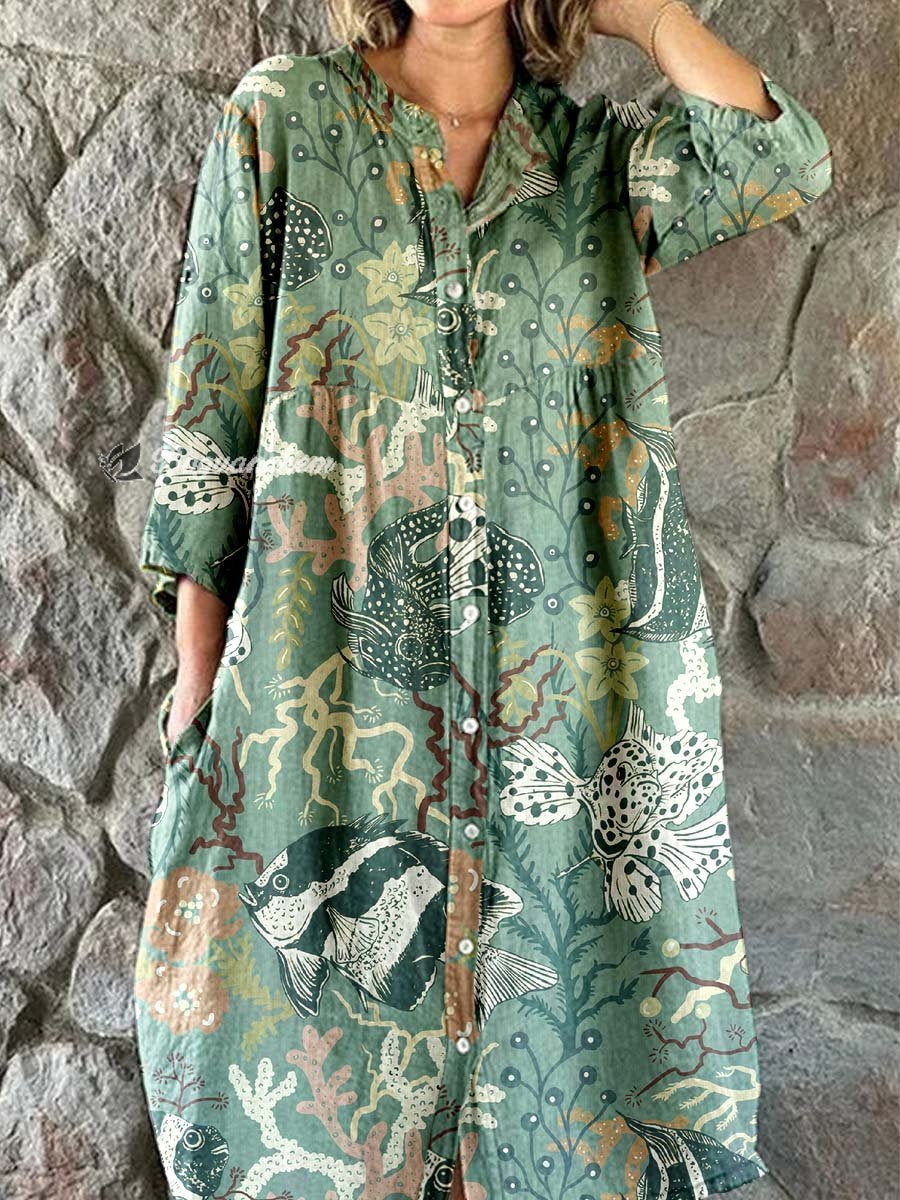 Women's Elegant Vintage Underwater World Pattern Print Shirt Style Cotton and Linen Dress