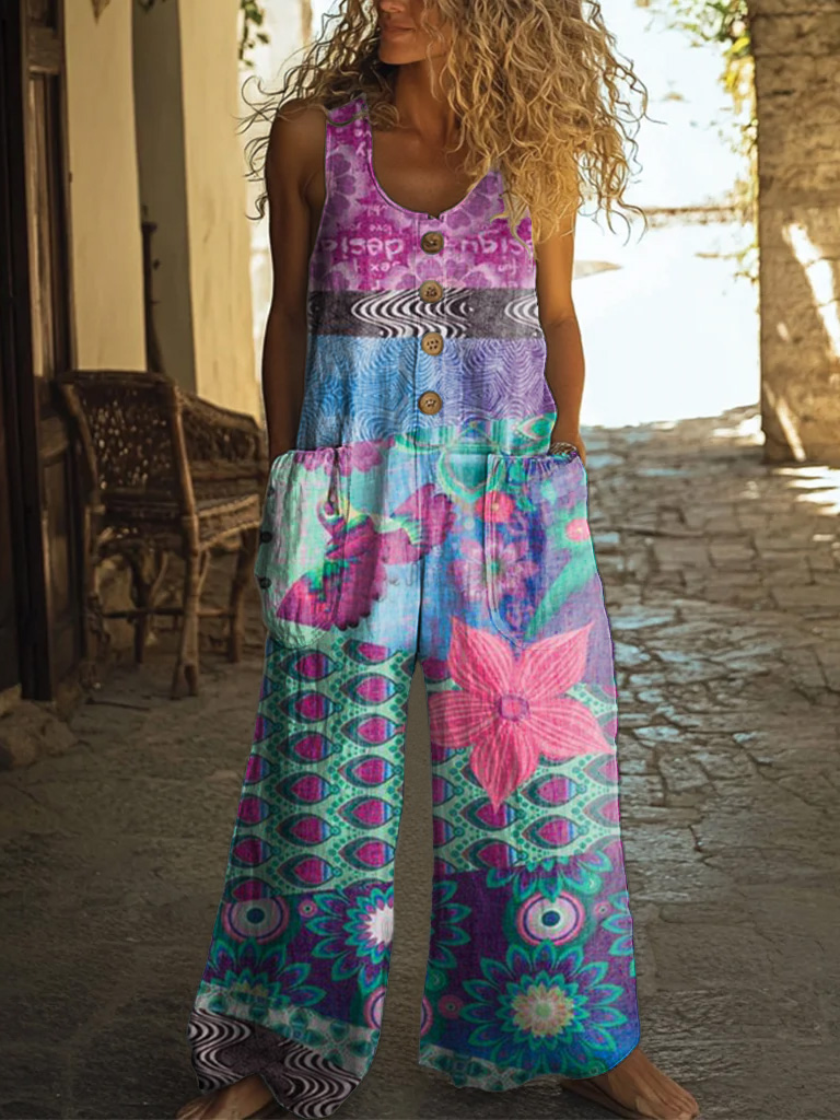 Women's Vintage Floral Mandala Embellished Pattern Art Print Casual Suspenders Wide Leg Pants