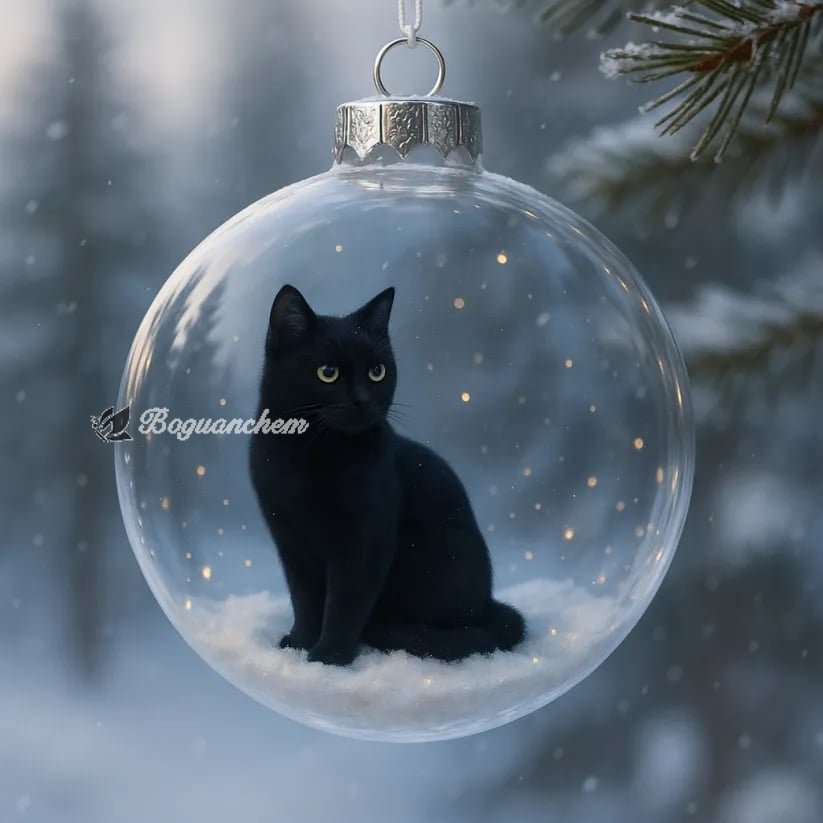 ✨ Nestled in his snowy glass globe, Midnight watches the falling snow with calm curiosity.