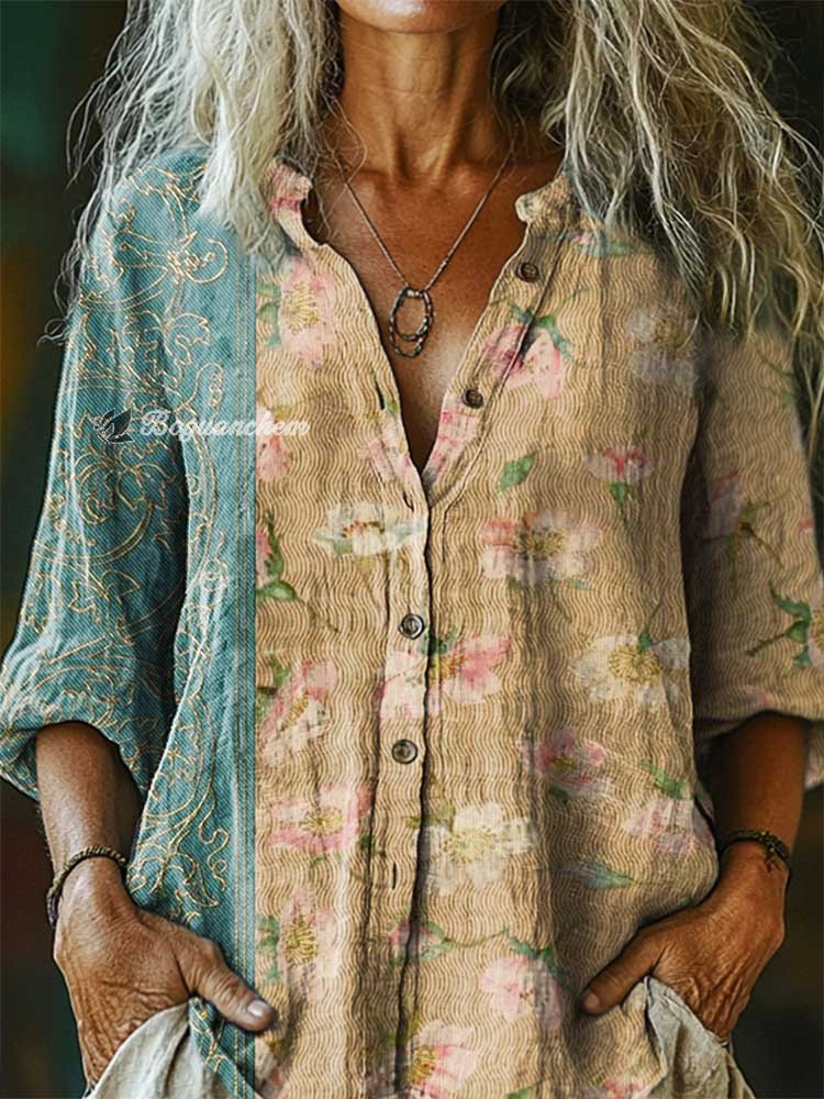 Floral Patchwork Pattern Art Print Cotton Linen Casual Women's Shirt