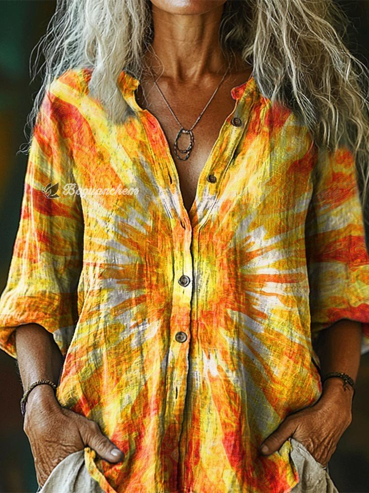 Retro Sun Visual impact Vintage Art Women's Print Casual Cotton Linen Shirt