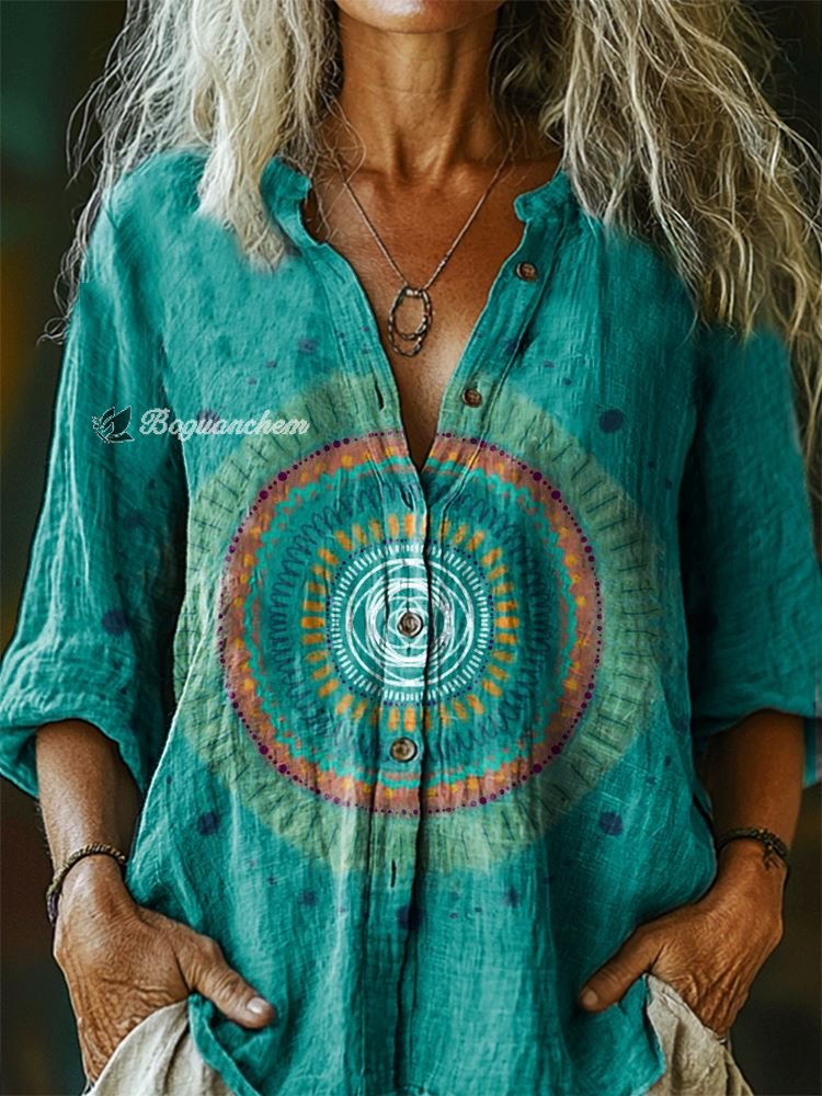 Women's Abstract Circle Pattern Art Print Casual Cotton Linen Shirt