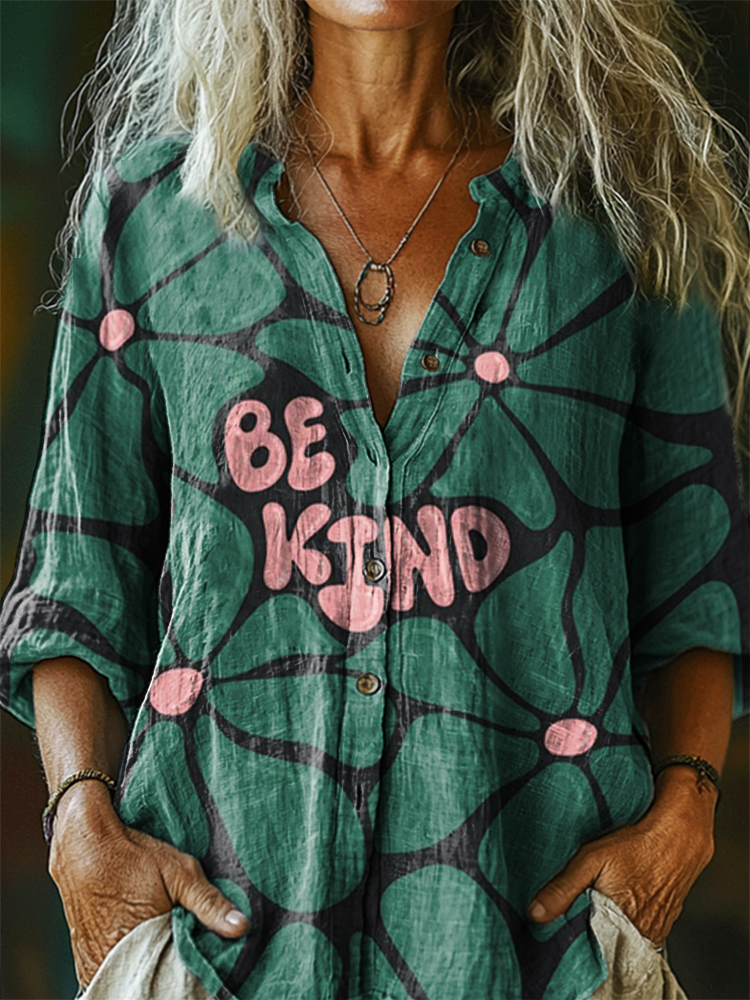 Women's Be Kind Floral Trim Pattern Art Print Linen Cotton Casual Shirt