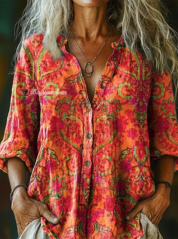 Women's Bohemian Ethnic Art Print Casual Cotton Linen Shirt