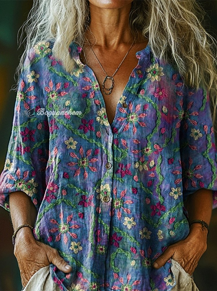 Womens Bohemian Ethnic Floral Art Print Casual Cotton Linen Shirt