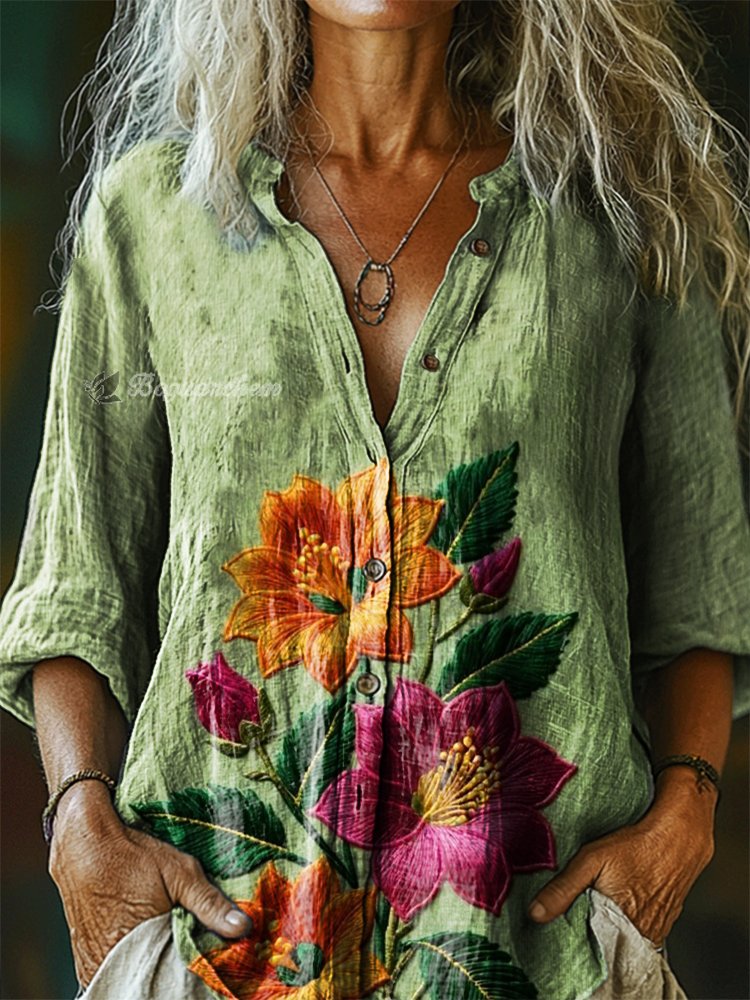 Women's Bohemian Floral Art Print Casual Cotton Linen Shirt