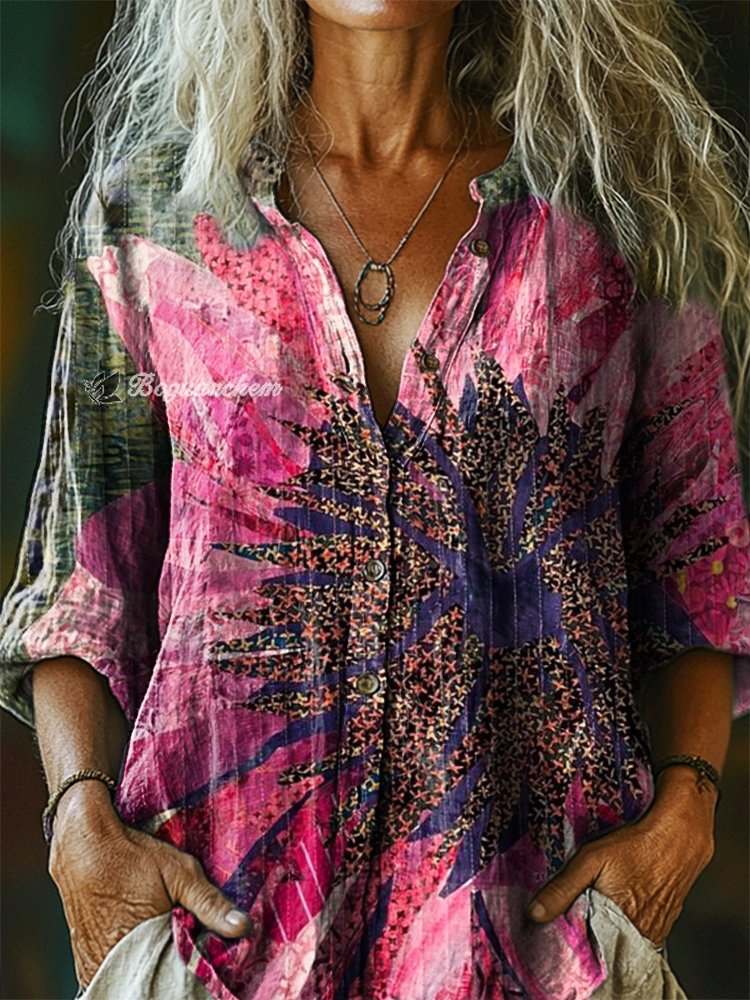 Women's Bohemian Floral Art Print Casual Cotton Linen Shirt