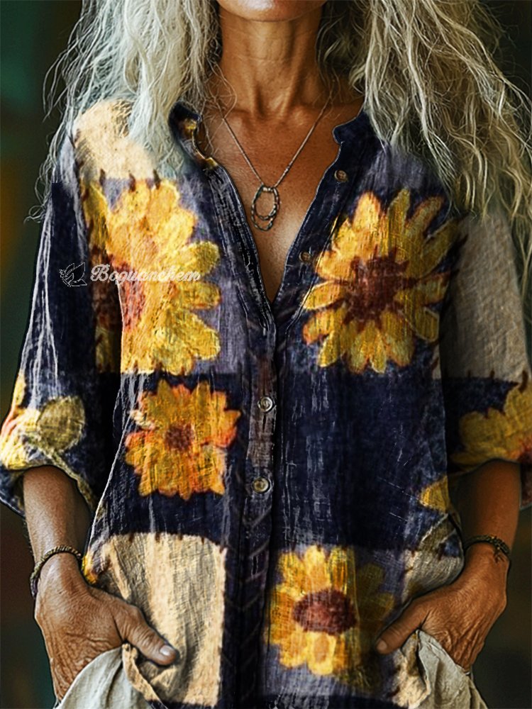 Women's Bohemian Floral Art Print Casual Cotton Linen Shirt