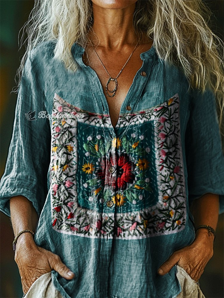 Women's Bohemian Floral Art Print Casual Cotton Linen Shirt