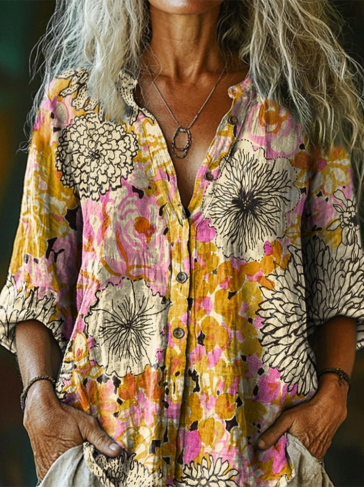 Women's Bohemian Floral Collage Art Print Casual Cotton Linen Shirt