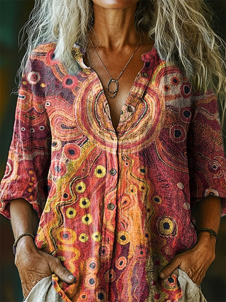 Women's Bohemian Irregular Pattern Art Print Casual Cotton Linen Shirt