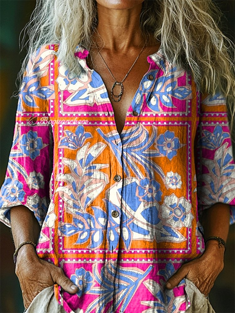 Women's Bohemian Style Floral Tattoo Pattern Art Print Casual Cotton Linen Shirt