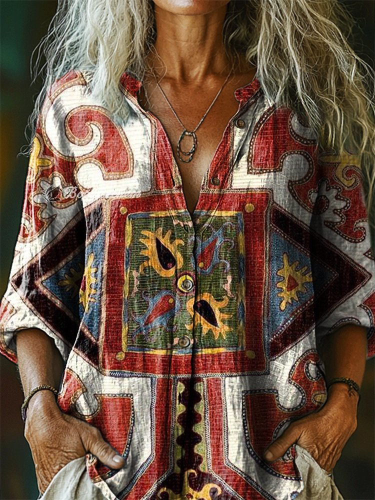 Women's Bohemian Totem Pattern Art Print Casual Cotton Linen Shirt