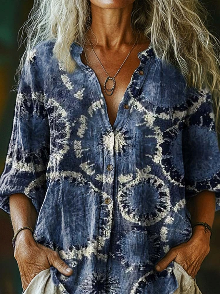 Women's Bohemian Vintage Tie-Dye Art Print Casual Cotton Linen Shirt