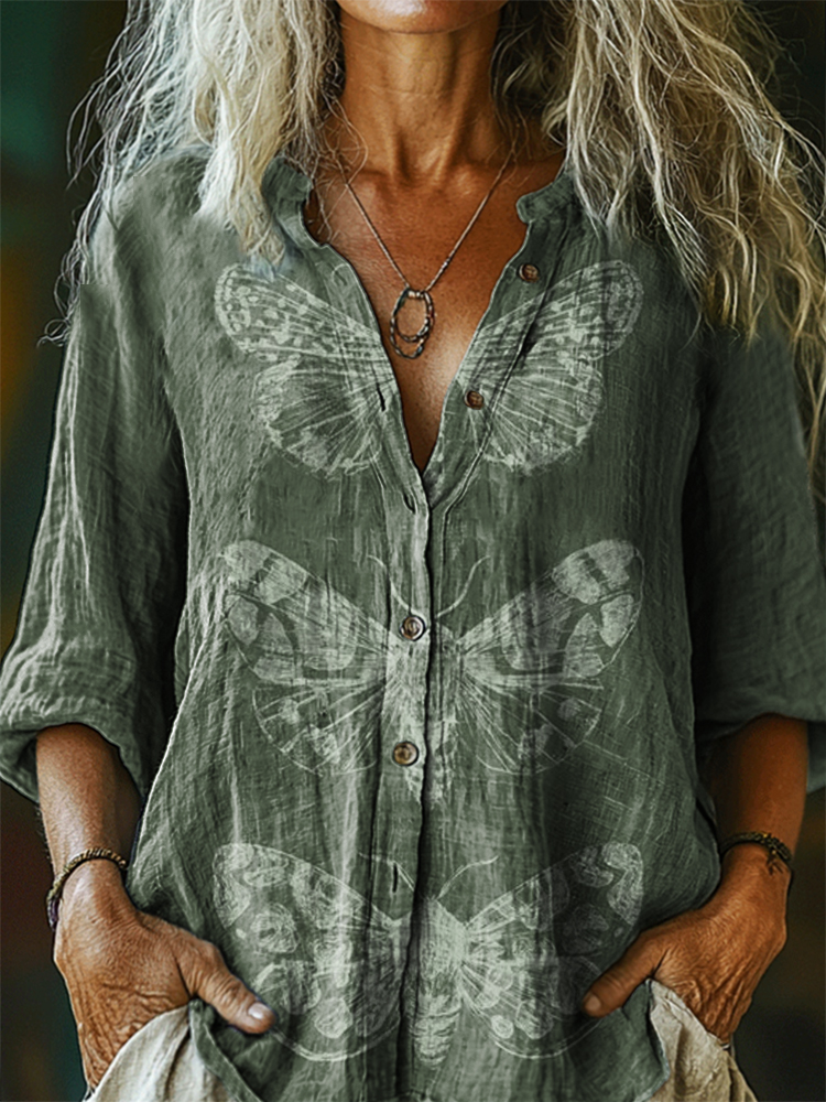 Women's Butterfly Embellished Pattern Art Print Casual Cotton Linen Shirt