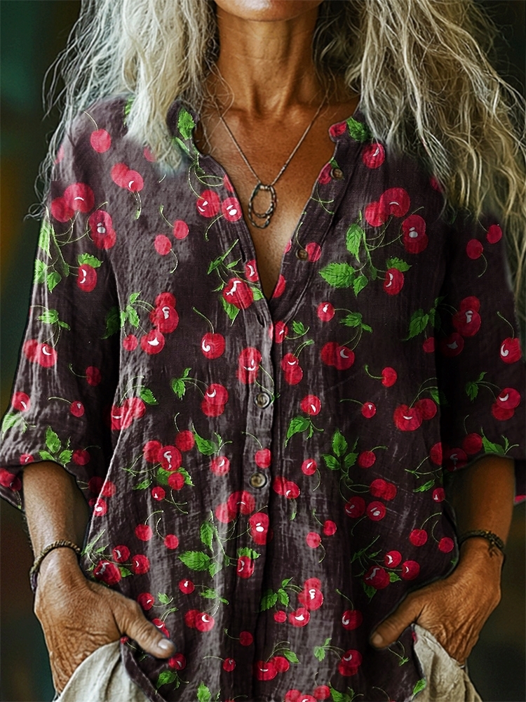 Women's Cherry Pattern Art Print Casual Cotton Linen Shirt