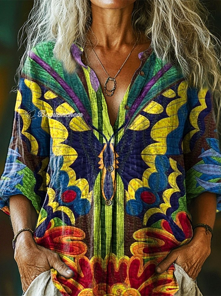 Women's Colorful Butterfly Texture Art Print Casual Cotton Linen Shirt