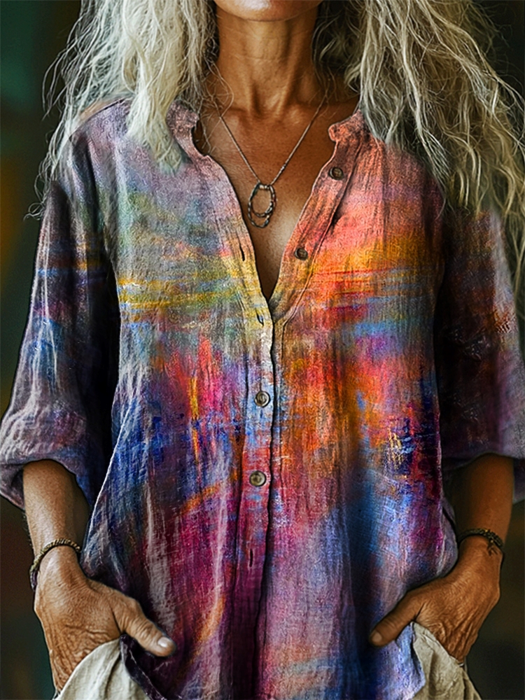 Women's Colorful Tie-Dye Pattern Art Print Linen Cotton Casual Shirt