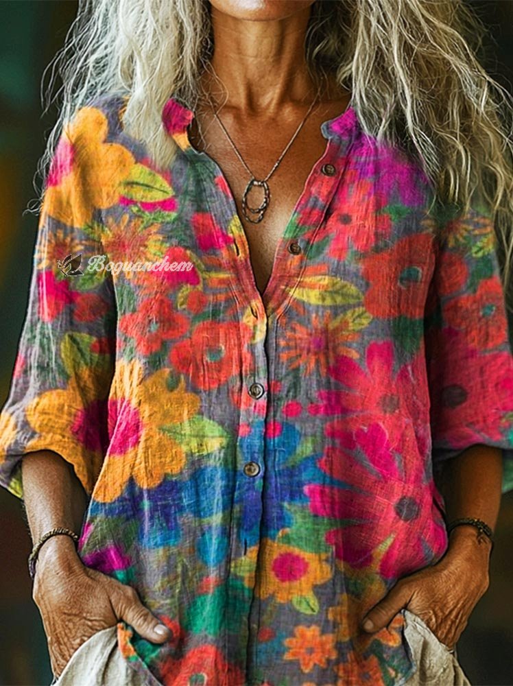 Women's Colorful Watercolor Flower Art Print Casual Cotton Linen Shirt