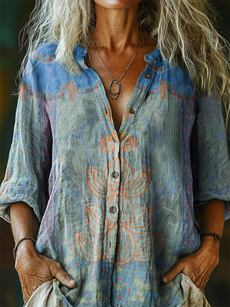 Women's Ethnic Lotus Tattoo Pattern Art Print Casual Cotton Linen Shirt