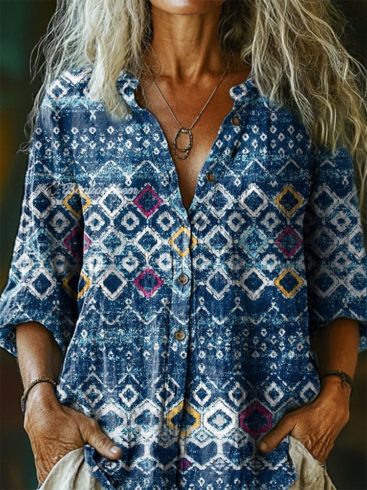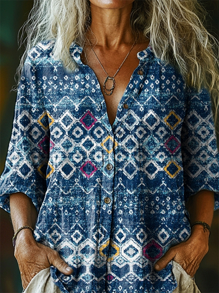 Women's Ethnic Tattoo Pattern Art Print Linen Cotton Casual Shirt