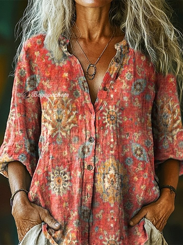 Women's Ethnic Totem Art Patterns Print Linen And Cotton V-neck Casual Shirt
