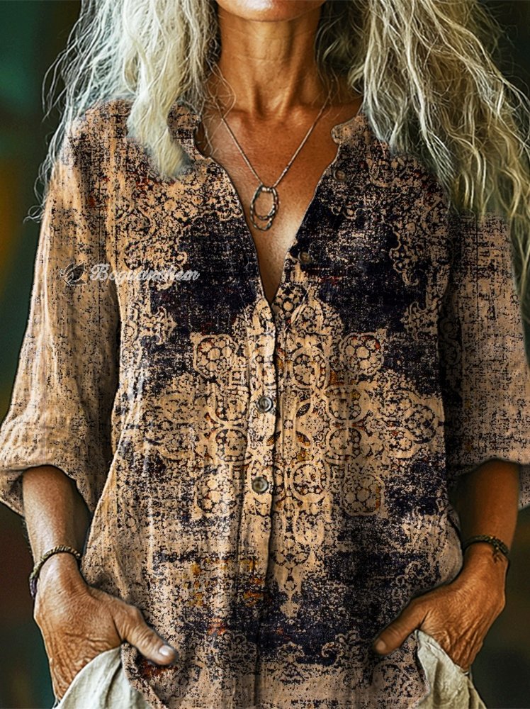Women's Ethnic Totem Art Print Casual Cotton and Linen Shirt