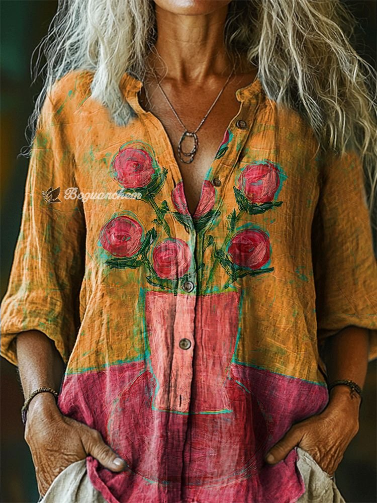 Women's Floral Clash Color Pattern Art Print Casual Cotton Linen Shirt