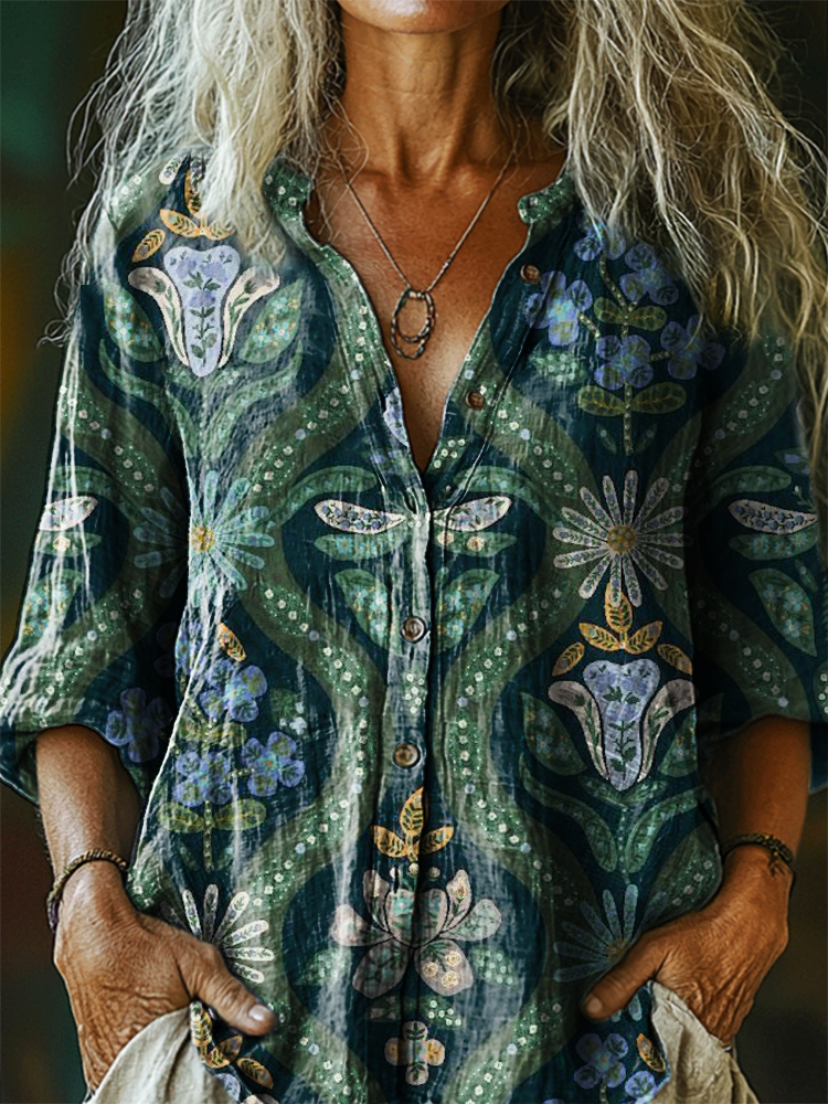 Women's Floral Dragonfly Art Print Casual Cotton Linen Shirt
