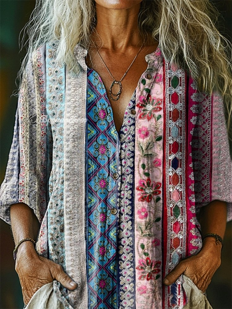 Women's Floral Pattern Art Print Casual Cotton Linen Shirt