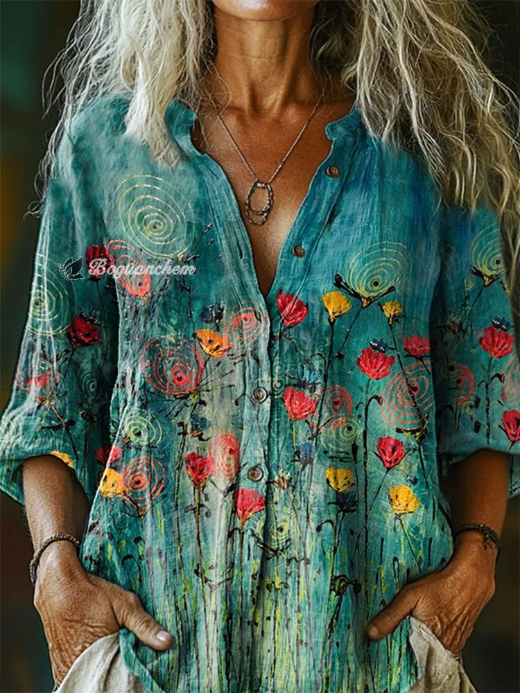 Women's Floral Pattern Art Print Casual Cotton Linen Shirt