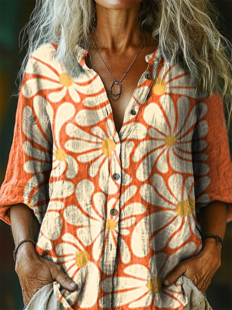 Women's Floral Pattern Art Print Linen Cotton Casual Shirt