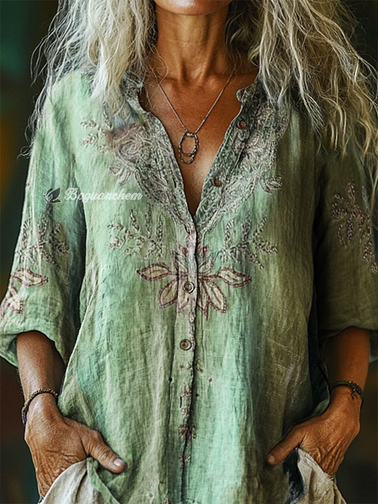 Women's Floral Tattoo Pattern Art Print Casual Cotton Linen Shirt