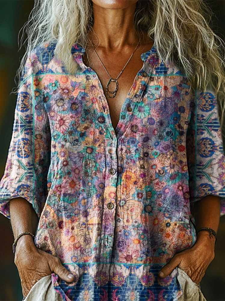 Women's Folk Flower Art Print Casual Cotton Linen Shirt