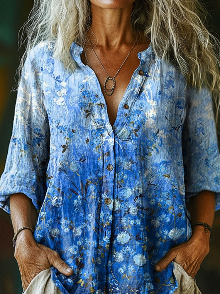 Women's Gradient Floral Tattoo Pattern Art Print Casual Cotton Linen Shirt