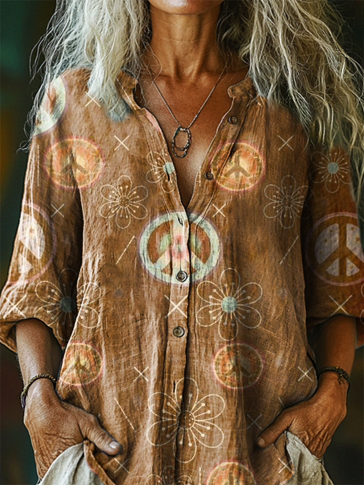 Women's Hippie Art Print Casual Cotton And Linen Shirt