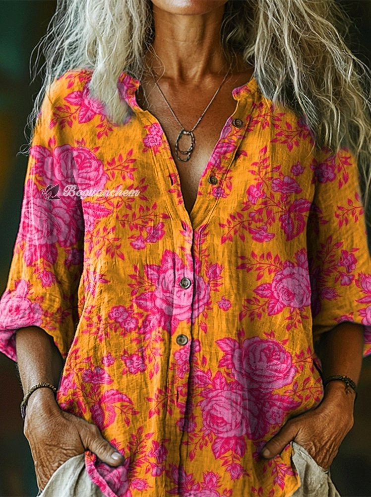 Women's Hippie Floral Art Pattern Print Casual Cotton Linen Shirt