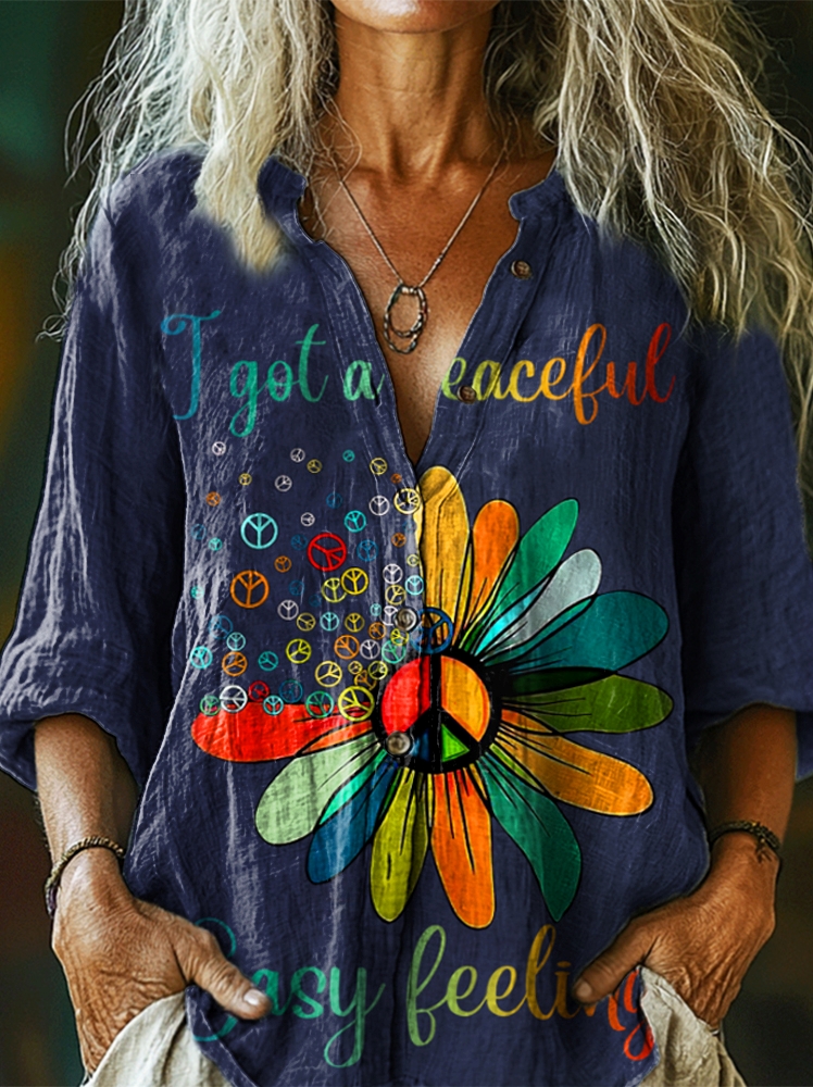 Women's Hippie I got an easy peaceful feeling sunflower Peace Sign Print Casual Cotton Linen Shirt