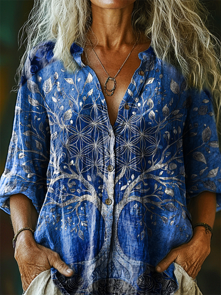 Women's Hippie Tree Art Print Casual Cotton Linen Shirt