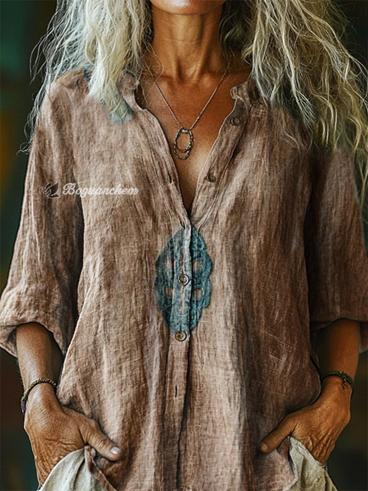 Women's Minimalist Style Tattoo Pattern Art Print Casual Cotton Linen Shirt