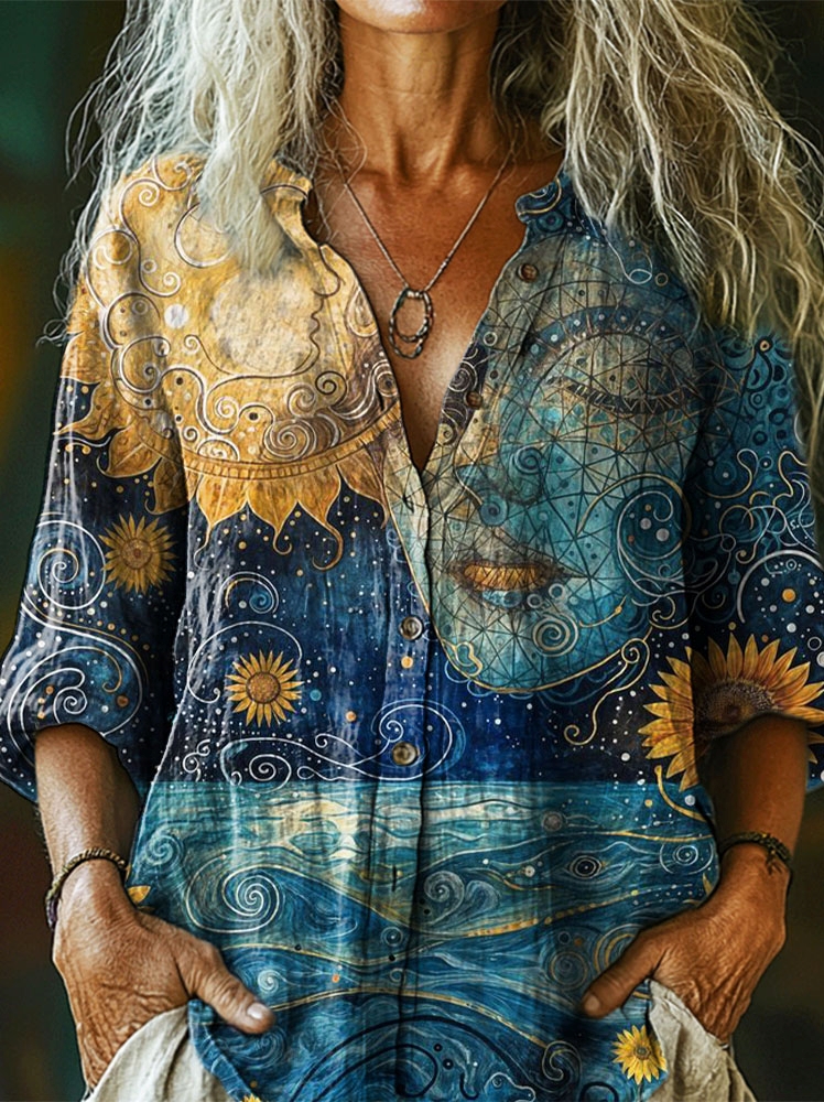 Women's Mysterious Sun Goddess Art Print Casual Cotton and Linen 3/4 Sleeve Shirt