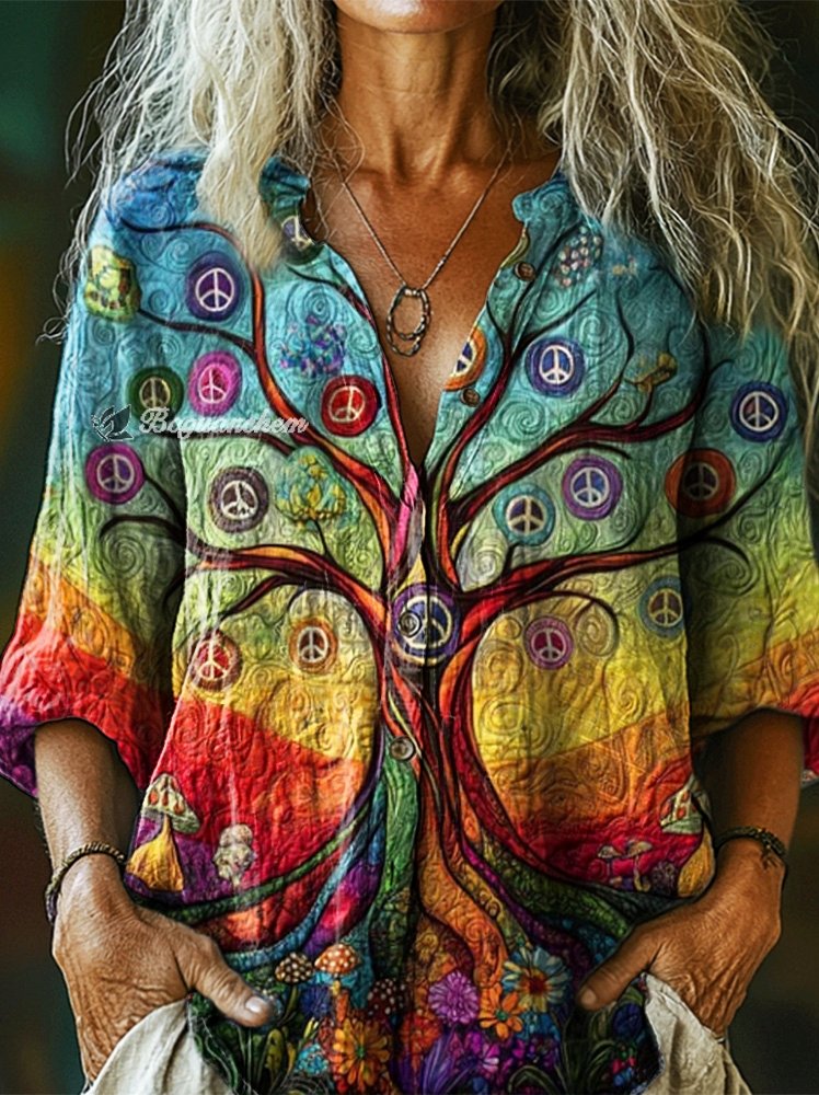 Women's Rainbow Hippie Peace Tree of Life Art Pattern Print Casual Cotton Linen Shirt