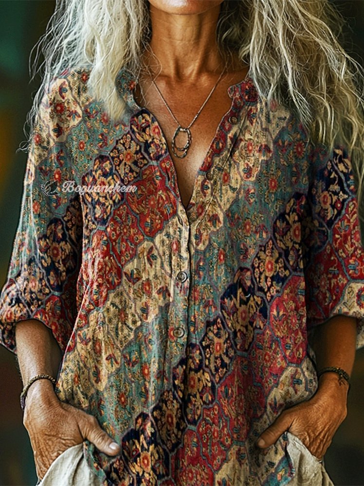 Women's Retro Ethnic Collage Art Pattern Print Casual Cotton Linen Shirt