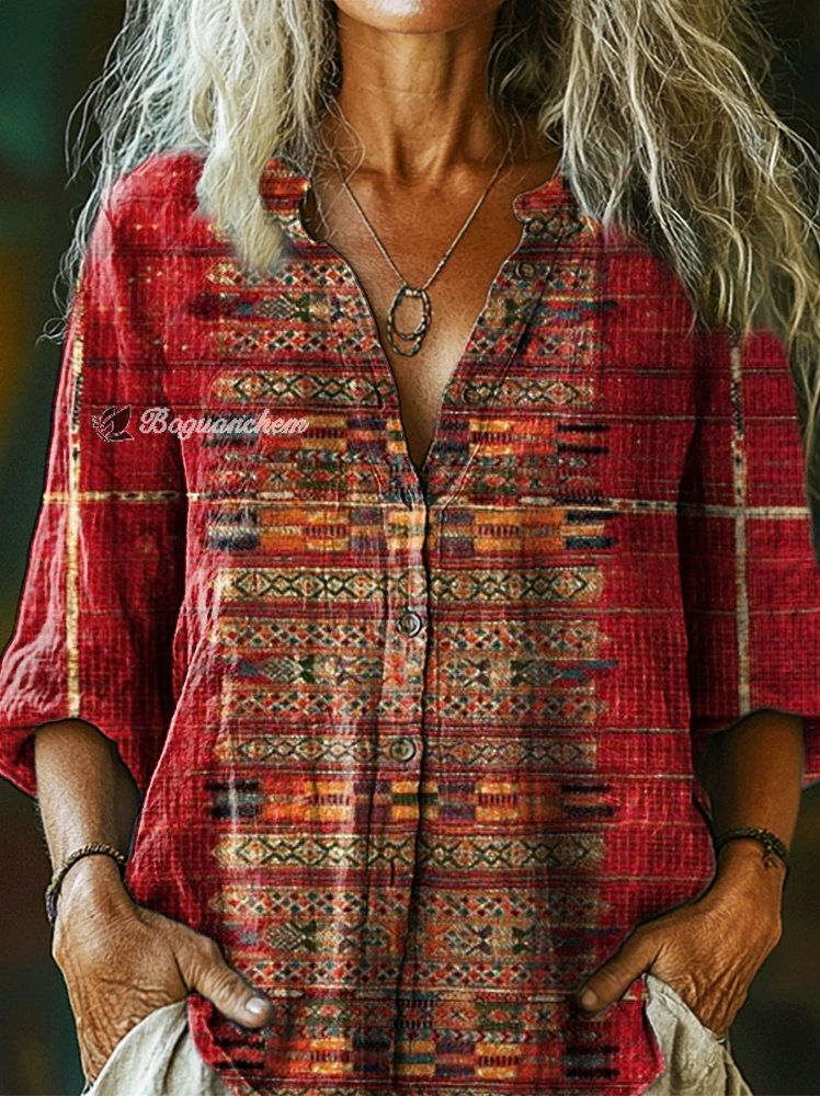 Women's Retro Ethnic Totem Art Print Casual Cotton Linen Shirt