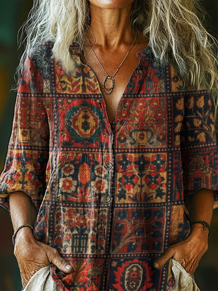 Women's Retro Ethnic Totem Floral Collage Art Print Casual Cotton Linen Shirt