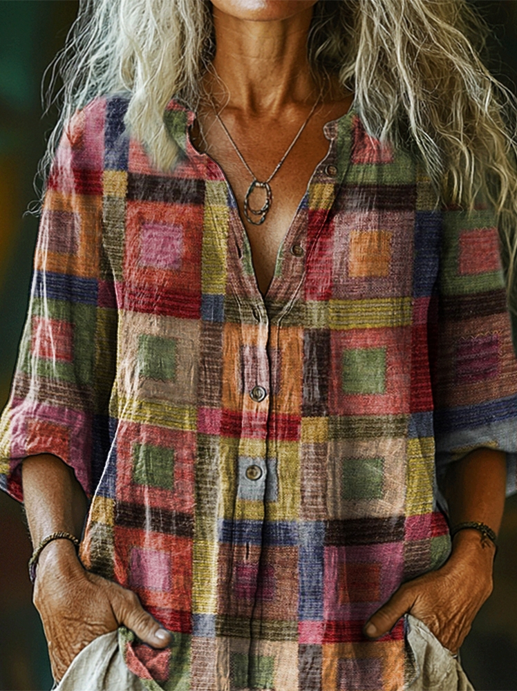 Women's Retro Geometric Collage Art Pattern Print Casual Cotton Linen Shirt