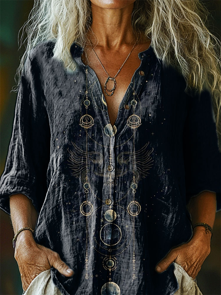 Women's Star and Moon Pattern Art Print Casual Cotton and Linen Shirt