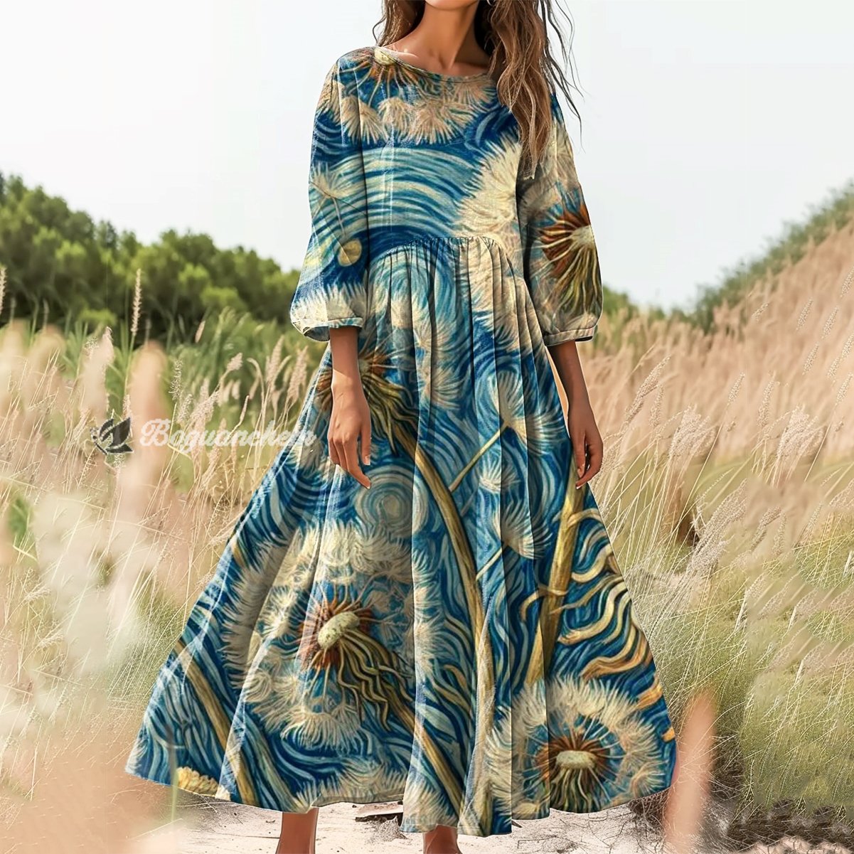 Gender: For Women Style: Casual Fit Type:FIt Shirt Length: Regular Sleeves Length:3/4 Sleeve Collar: Round Collar Material: 100%Cotton Material Stretch: No Stretch Pocket :Side poctket Weight: 0.300kg Package:1 x Dress